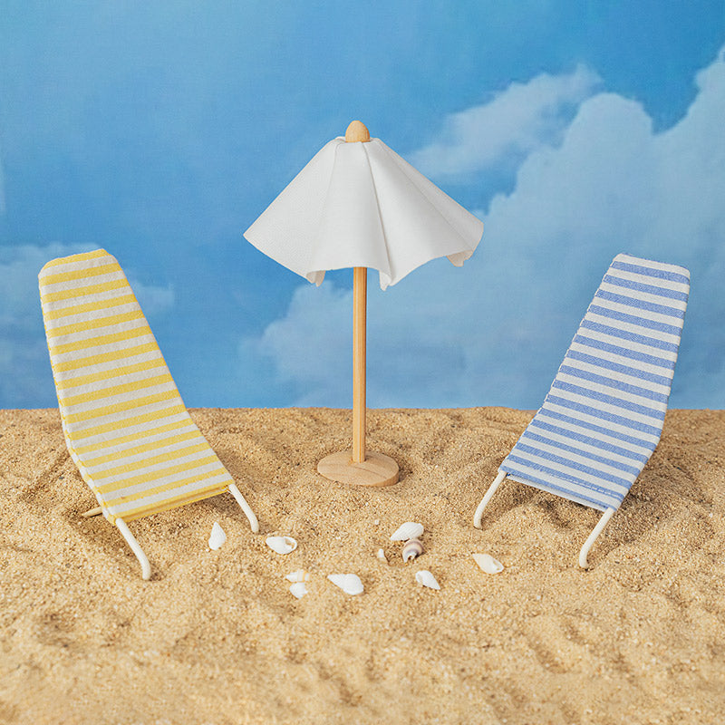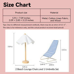 2 Beach Lounge Chairs and 1 Umbrella Set – 1:12 Scale Dollhouse Furniture