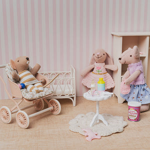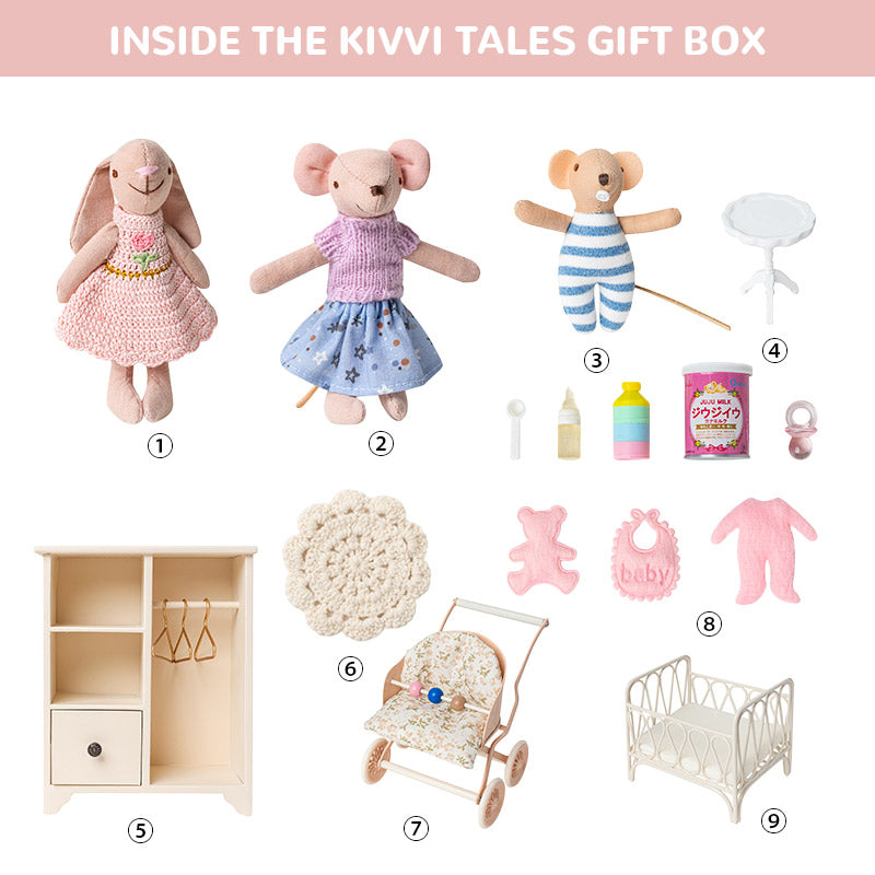 A nurturing nursery-themed dollhouse gift set where Pippin learns to care for the neighbor’s baby with the help of Milo, Biscuit, and Nibs. Soft, warm, and full of tiny details.