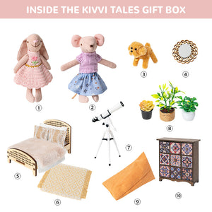 A dreamy nighttime dollhouse gift box where Milo and Pippin imagine building a flying ship to explore the stars over Kivvi Town. Includes bed, nightstand, telescope, and moonlight backdrop.