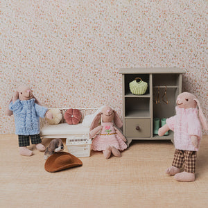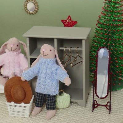 A cozy wardrobe-themed dollhouse gift set where Oliver prepares to head out, only to realize his favorite old hat is missing.