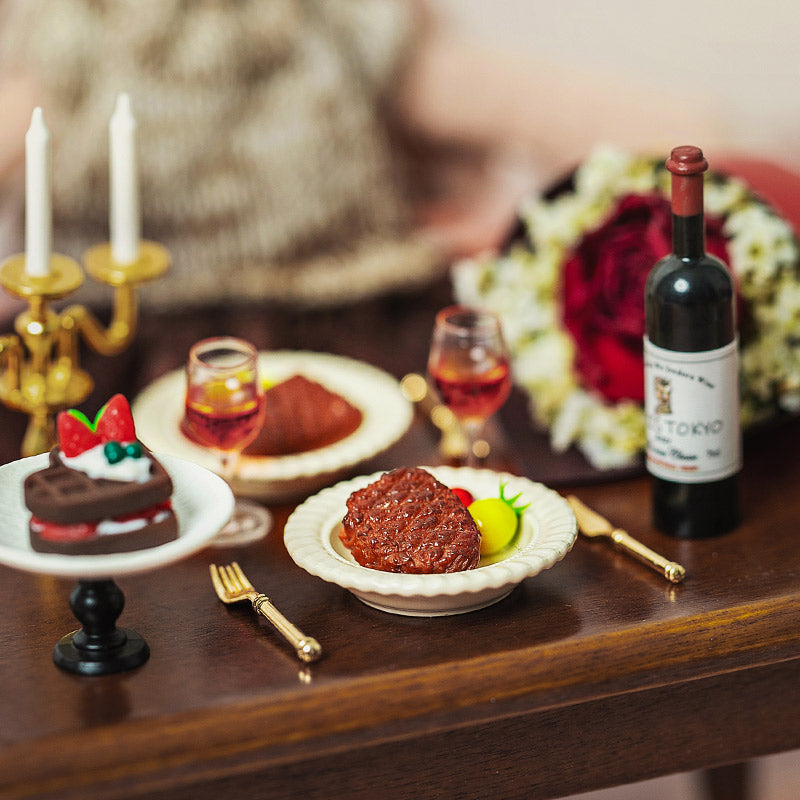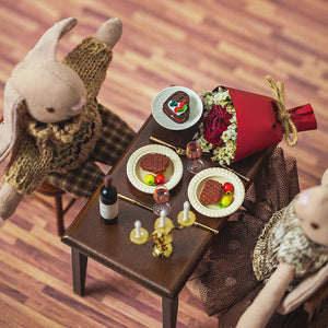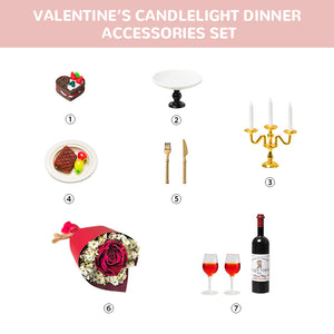 Candleholder, plates, wine glasses, dessert and floral details — designed to bring warmth and emotion to any miniature dining scene.