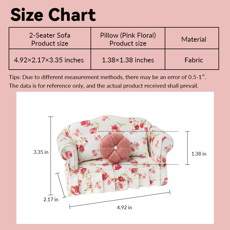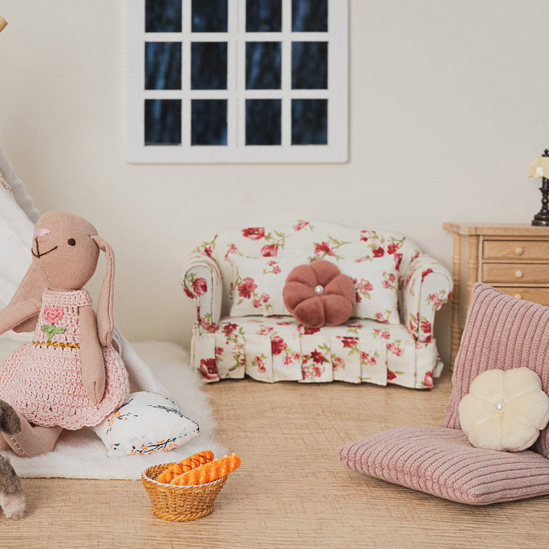 Vintage Floral 2-Seater Sofa with Pink Floral Pillow – 1:12 Scale Dollhouse Furniture