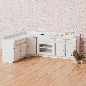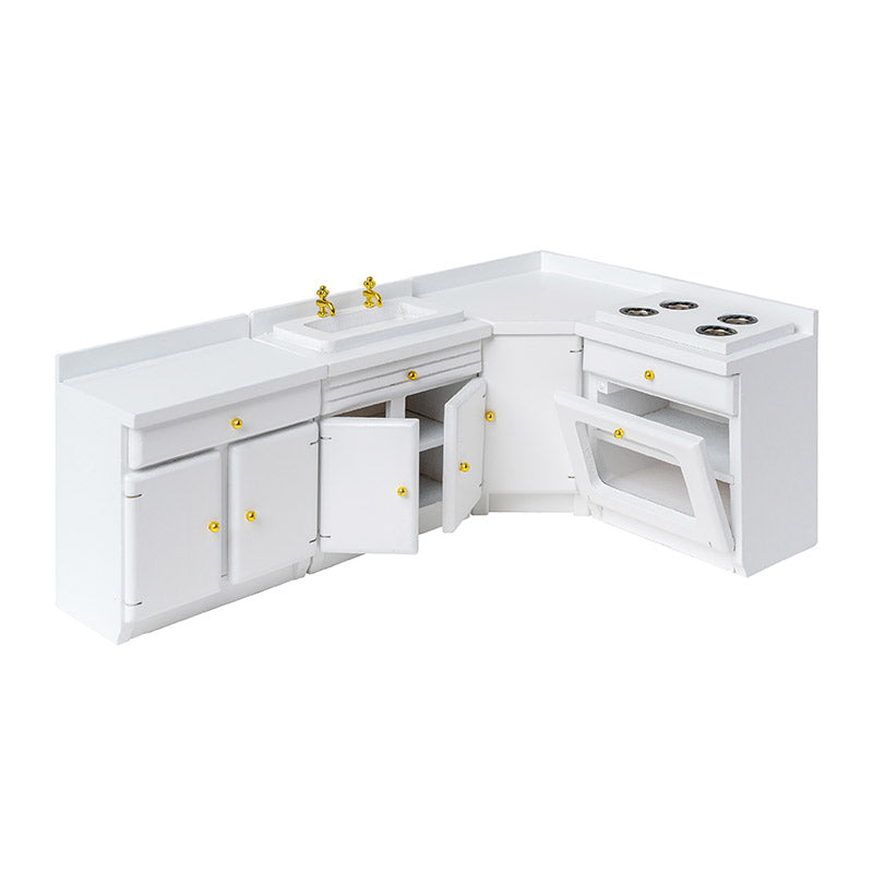 White L-Shaped Kitchen Counter with Sink and Stove – 1:12 Scale Dollhouse Furniture